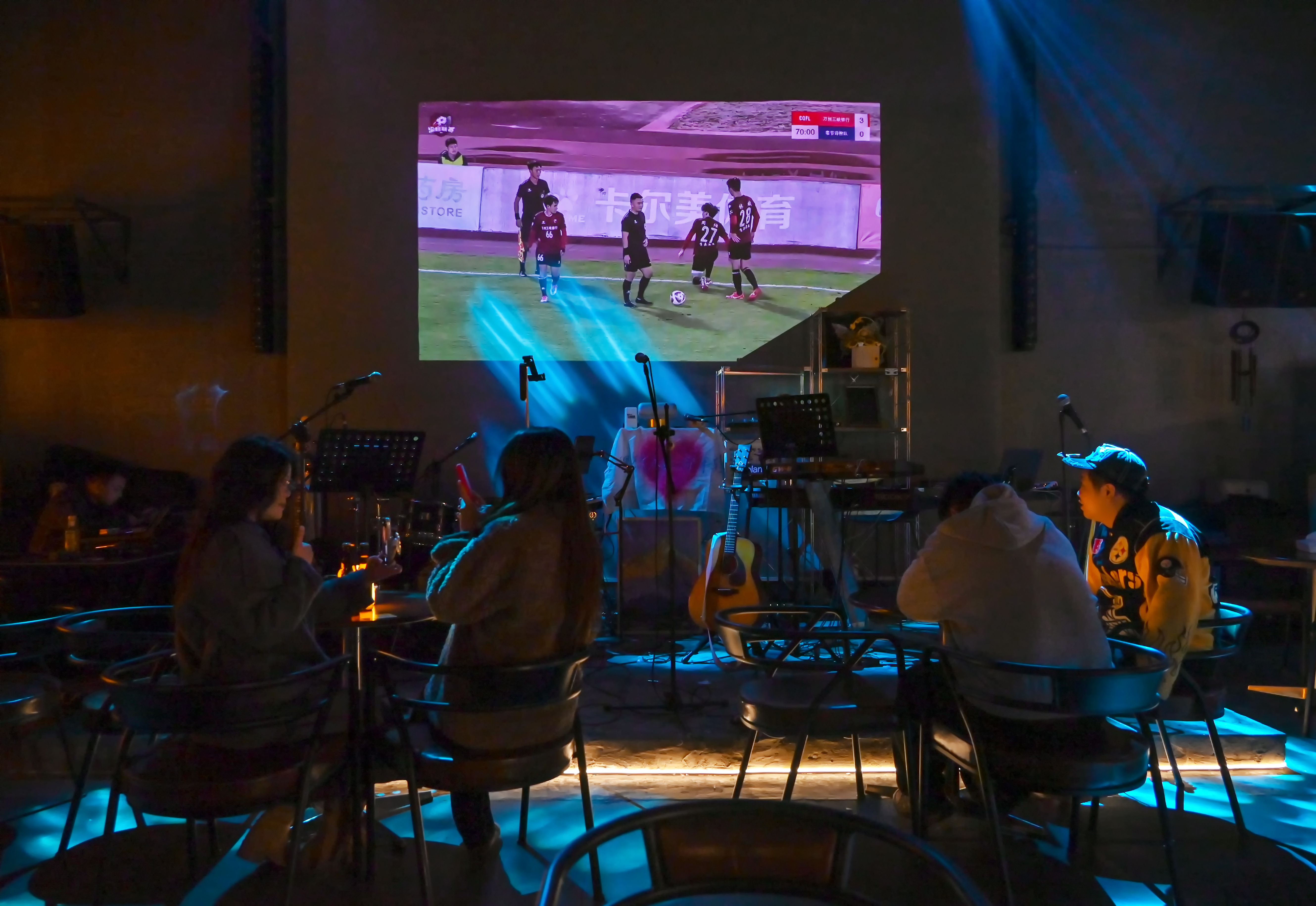 ▲11月8日,万州红花地码头美食街,市民在酒吧观看万州三峡银行队与奉节诗橙队的比赛。通讯员 付作侨 摄