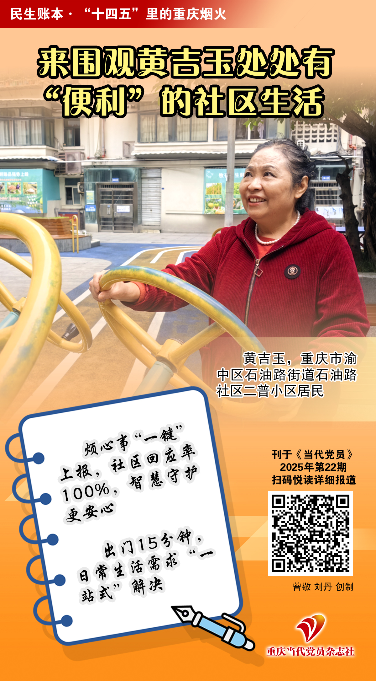 今天推出“民生账本•‘十四五’里的重庆烟火”系列报道第7期《来围观黄吉玉处处有“便利”的社区生活》,讲述重庆市渝中区石油路街道石油路社区居民黄吉玉,在重庆“141”基层智治体系建设中所感受到的社区便利。