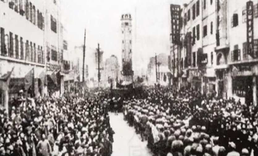 当涌上街头的群众来到“抗战胜利纪功碑”(现解放碑)时,看到其顶上高高飘扬着一面五星红旗,大家激动得热泪盈眶。