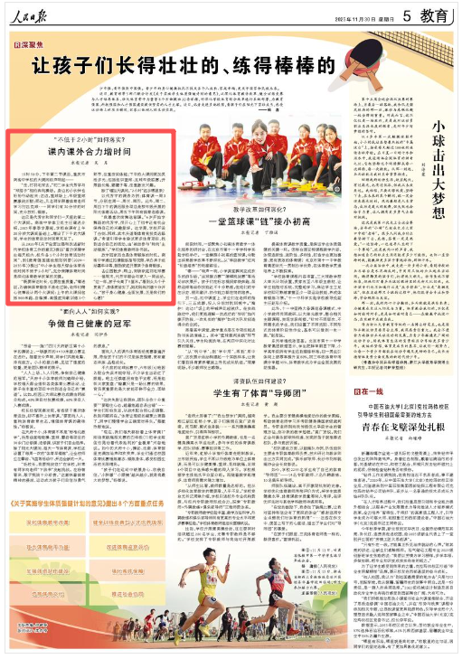 从2020年《关于全面加强和改进新时代学校体育工作的意见》提出“着力保障学生每天校内、校外各1个小时体育活动时间”,到《教育强国建设规划纲要(2024—2035年)》提出“中小学生每天综合体育活动时间不低于2小时”,充分保障体育时间是深化体育教学改革的关键。