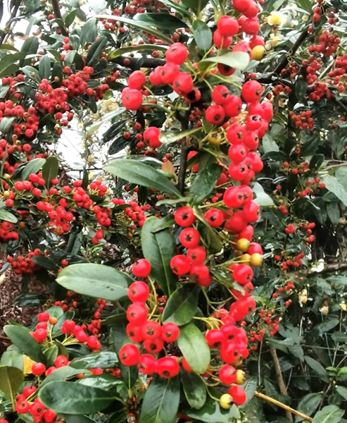红籽刺树米余高,有的碗粗,酒杯大小,盘根错节,枝刺交错,长而细的茂密枝条,一穗一穗挂满一颗颗鲜艳的红籽果,或浅红,或绯红,或深红,密密麻麻,层层叠叠,像朝霞,像红云,像玛瑙,又像一簇簇、一串串燃烧着的火把,难怪有的地方也叫它“火棘”。