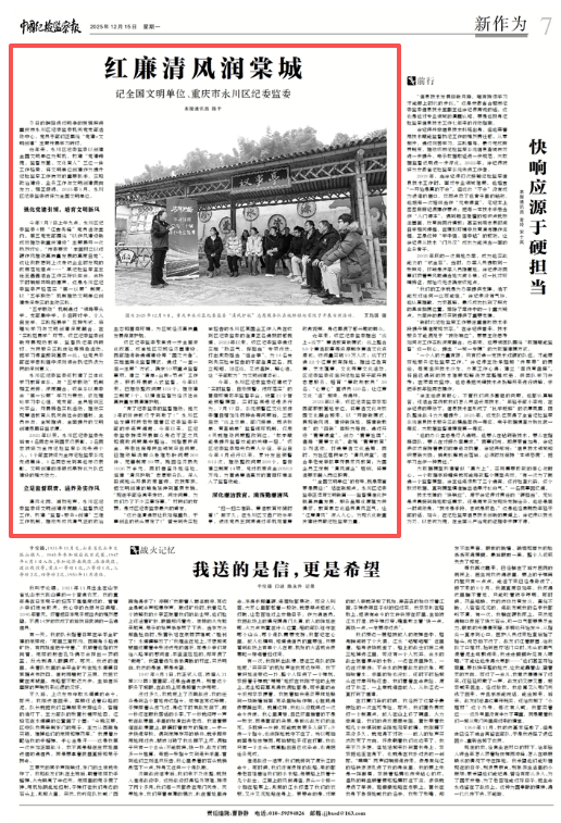 清风化雨,润物无声。永川区纪委监委将文明创建深度融入监督执纪工作,构建“监督+服务+创建”三维工作机制,推动形成风清气正的政治生态和营商环境,为区域经济高质量发展保驾护航。