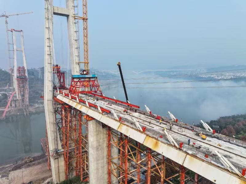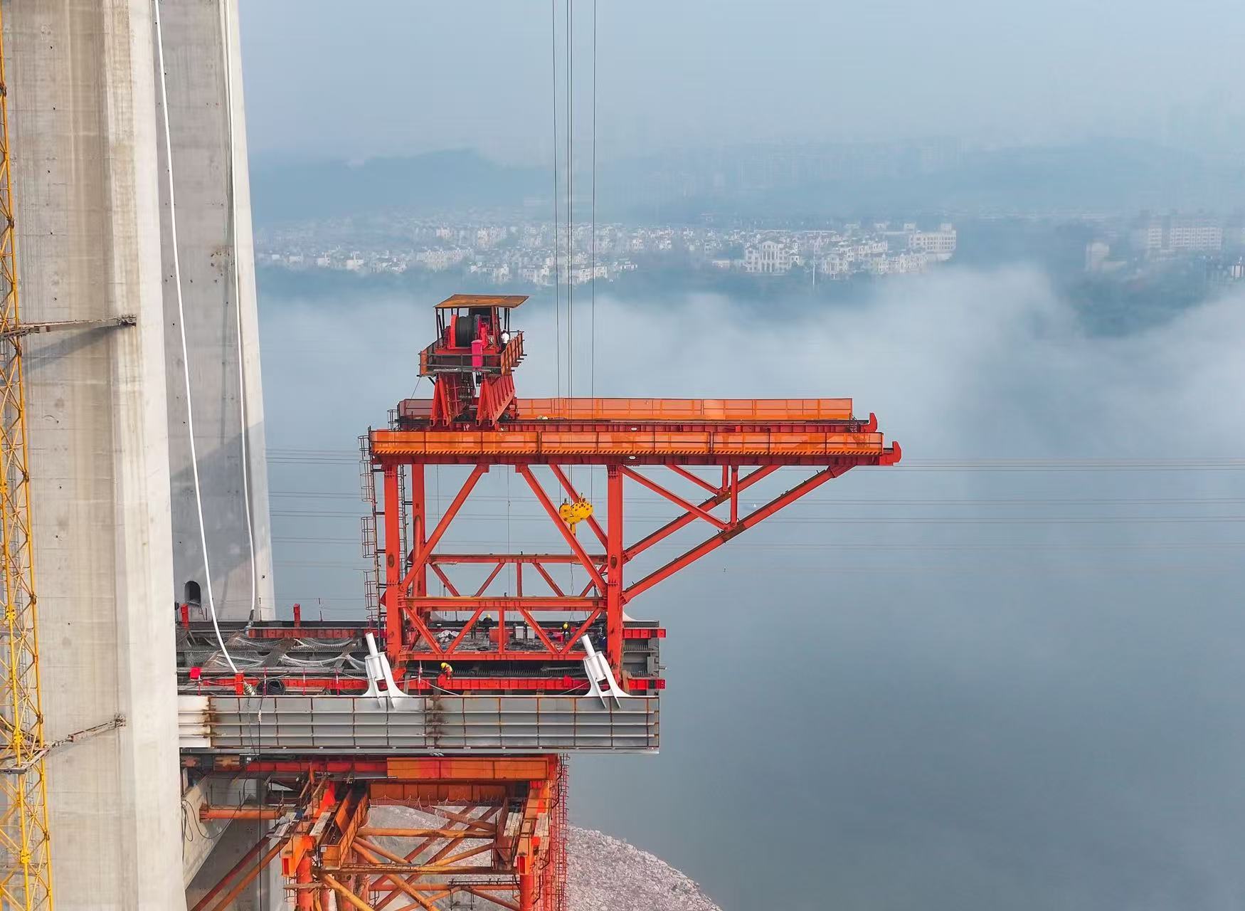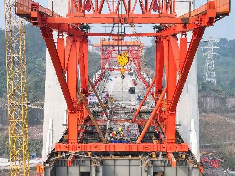 12月18日,成渝中线高铁控制性工程——井口嘉陵江特大桥建设取得阶段性进展。目前,大桥边跨钢梁架设已完成,专用架板机、运板车已进场开展桥面板安装作业,标志着工程正式转入桥面板安装阶段,为后续主跨钢梁架设创造了有利条件。