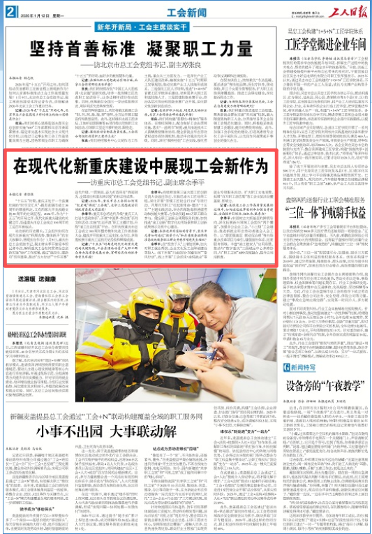 站在新的历史潮头,工会组织如何在现代化新重庆“积厚成势、整体跃升”的宏大叙事中,展现担当作为?1月9日,重庆市总工会党组书记、副主席余季平接受本报记者专访,解码重庆工会如何贯彻全总创新实施“559”工作部署,通过“强深化、建新功”的双重奏,推动“五大行动”“十件实事”迭代升级、一贯到底,奋力打造具有“西部领先、全国进位和重庆辨识度”的标志性成果。