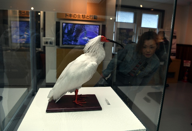 这是5月3日在日本新潟县佐渡岛朱鹮森林公园拍摄的游人观看朱鹮标本的照片。(新华社记者马平摄)