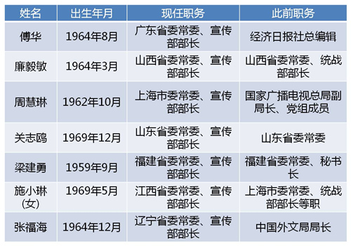 今年以来,7省份省委宣传部部长调整。他们是广东的傅华、山西的廉毅敏、上海的周慧琳、山东的关志鸥、福建的梁建勇、江西的施小琳和辽宁的张福海。
