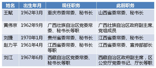 此外,3人为本省转任,且3人的任职经历都一直在本省。他们是:广西壮族自治区党委常委、秘书长黄伟京,江西省委常委、秘书长赵力平和西藏自治区党委常委、秘书长刘江。其中,黄伟京和刘江此前均担任省级政府副职。
