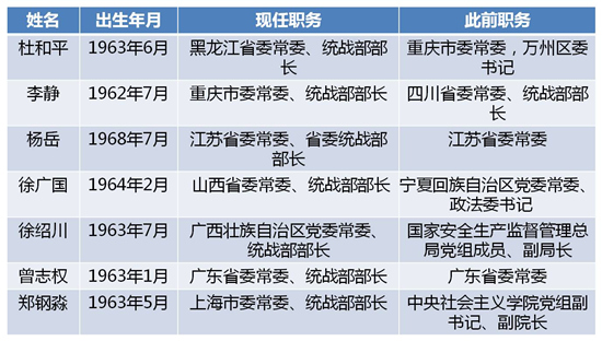 据记者统计,今年已有黑龙江、重庆、江苏、山西、广西、广东和上海等七省份省委统战部部长调整。他们分别是黑龙江省委常委、统战部部长杜和平,重庆市委常委、统战部部长李静,江苏省委常委、统战部部长杨岳,山西省委常委、统战部部长徐广国,广西壮族自治区党委常委、统战部部长徐绍川,广东省委常委、统战部部长曾志权和上海市委常委、统战部部长郑钢淼。
