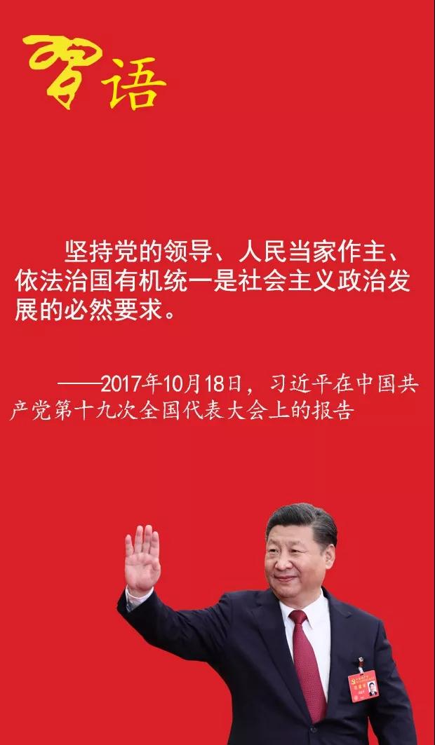 10月28日至31日,党的十九届四中全会在北京召开。研究坚持和完善中国特色社会主义制度、推进国家治理体系和治理能力现代化若干重大问题,是会议的鲜明主题。党的十八大以来,习近平总书记多次就坚持和完善中国特色社会主义制度、推进国家治理体系和治理能力现代化作出重要论述。其中,“坚持党的领导、人民当家作主、依法治国有机统一”更是反复提及。这三者统一于我国社会主义民主政治伟大实践。以下总书记关于此方面的部分论述,与您一起学习。