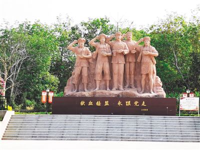 在木排村西北边有个纪念园,园里用红花岗岩石雕刻成的5人群像,向人们讲述着77年前发生在木排根据地“歃血结盟”的感人故事。