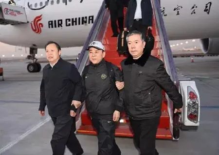 职务犯罪嫌疑人张德友(中)被带下舷梯 图片来源:中央纪委国家监委网站