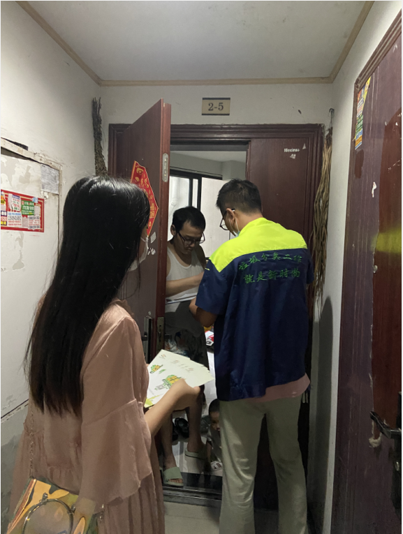 ▲环卫集团工作人员和社区网格员入户走访宣传 图/郭馨蔓