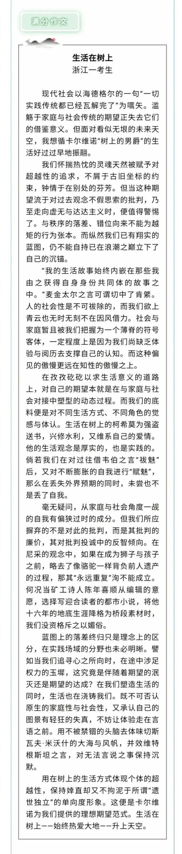 日前,浙江高考满分作文《生活在树上》在网上引发热议。姑且不提文中提到的卡尔维诺、维特根斯坦、麦金太尔等人名,以及所使用的振翮、一觇等生词,单是篇首第一句话“现代社会以海德格尔的一句‘一切实践传统都已经瓦解完了’为嚆矢”已经让很多读者“望之却步”。文章是好是坏,网上众说纷纭。今天我们就来聊聊这个话题。