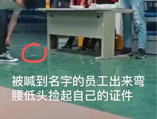 三名分发证件的管理人员不停地念出员工的名字,然后将一张一张证件全部丢在地上,每一个需要领证件的员工都要走在他们面前低头弯腰,像鞠躬一样捡起证件。