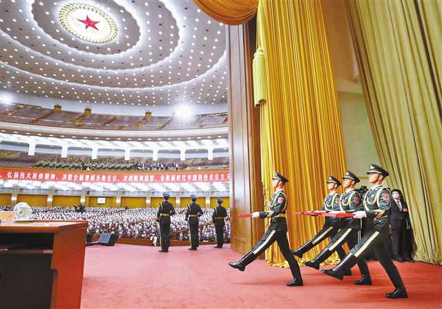 9月8日,全国抗击新冠肺炎疫情表彰大会在北京人民大会堂隆重举行。这是4名礼兵手捧共和国勋章、国家荣誉称号奖章,行进到仪式现场。