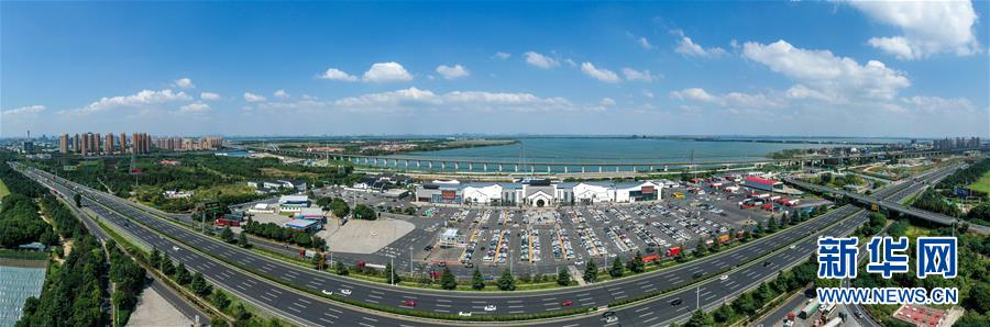 ▲ 这是沪宁高速公路苏州段阳澄湖服务区(10月8日摄,无人机全景拼接照片)。阳澄湖服务区于2019年5月完成升级改造,通过大型水景等元素还原“诗画江南”意境,成为当地的“新景点”。新华社记者 李博 摄