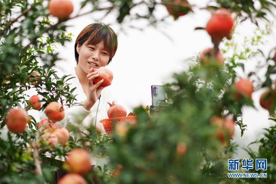 ▲ 河北省邢台市内丘县五郭店乡东磁窑沟村农民在石榴园通过网络直播销售石榴(10月2日摄)。新华社记者 朱旭东 摄