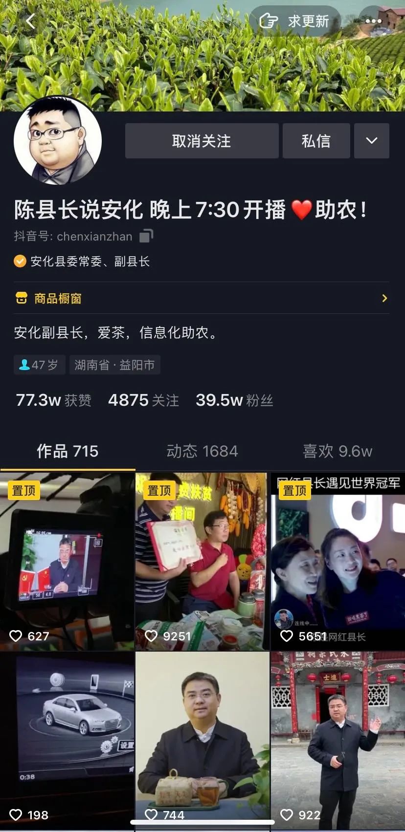 据安化当地统计,大约半年中,陈灿平做了300余场直播,总销售额1500多万元,位于抖音茶类主播前列。如今,这位网红县长的粉丝数已超过39万,是平台上拥有实名认证的县长之首。