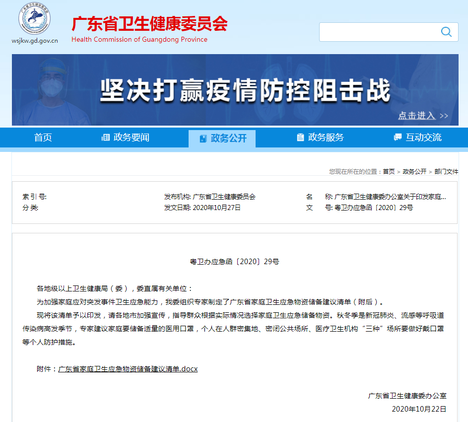 日前,广东省卫健委印发了《关于家庭卫生应急物资储备建议清单的通知》(以下简称《通知》)。