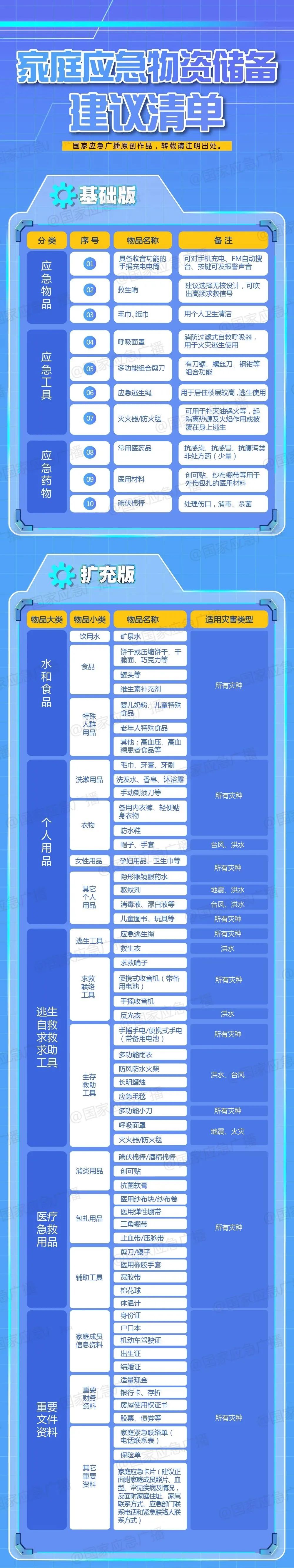 国家发改委等14部门印发:全国家庭应急物资储备建议清单!