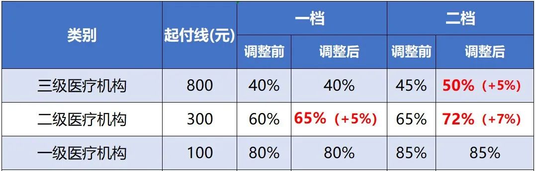从2021年1月起,参保人员住院发生的政策范围内医疗费用,一档参保人在二级医疗机构报销比例提高5%,二档参保人在二级医疗机构报销比例提高7%,在三级医疗机构报销比例提高5%,逐步提高政策范围内住院费用支付比例达到70%左右。