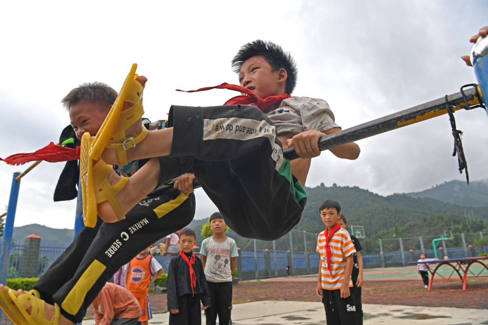 广西百色市凌云县泗城镇览金小学学生在玩单杠。新华社记者 周华 摄