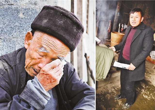 左图为二○一九年十月一日,贵州省铜仁市沿河土家族自治县中寨镇大坪村村民张信龙谈起文伟红时伤心落泪(新华社记者胡星摄);右图为二○一八年十二月二十七日,文伟红在沿河土家族自治县中寨镇大坪村村民家中走访。新华社发