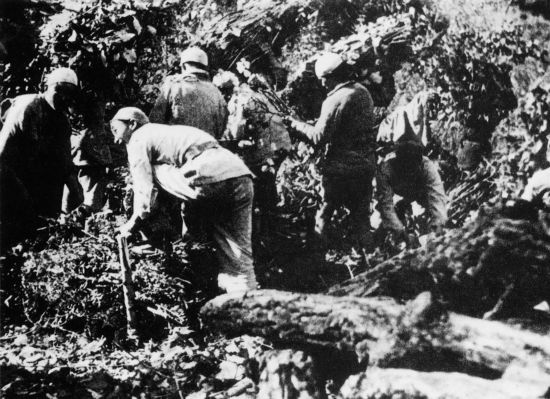 1943年张思德(左一)带领中央警卫团的战士在烧木炭。