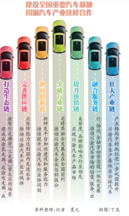 为此,川渝两地汽车产业将通过“串珠成链”,推动一揽子合作,具体包括打造生态链、完善供应链、协同创新链、突破行业链、提升价值链、融合服务链、壮大产业链。