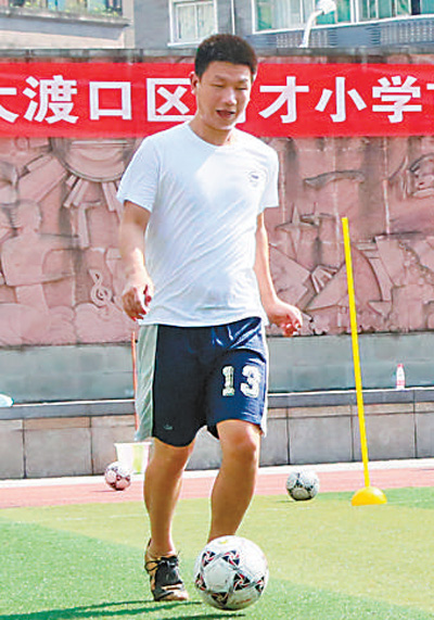 2016年6月,王红旭在参加体育教师基本功考核足球项目。