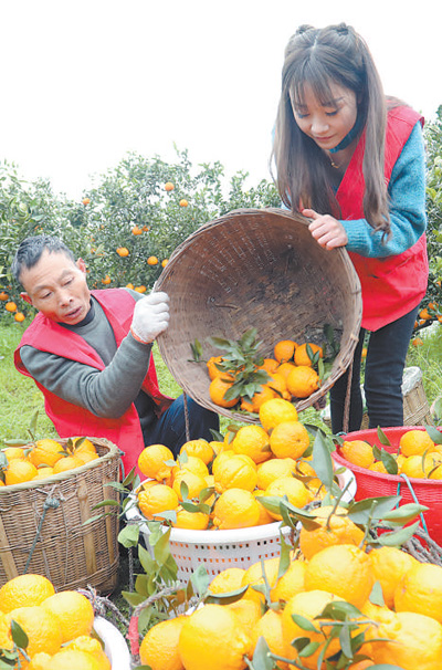 四川省仁寿县板桥镇团圆社区,党员干部帮助果农采摘柑橘。潘 帅摄(人民视觉)