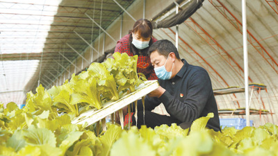 河北省邢台市南和区和阳镇东侯庄村,党员与农户在了解水培蔬菜生长情况。张 驰摄(新华社发)