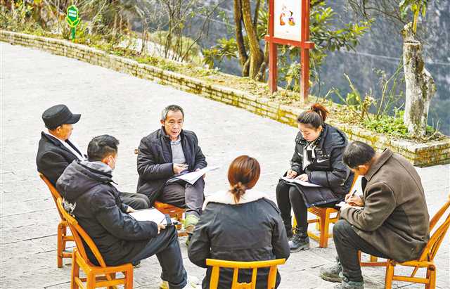 二月十五日,巫山县竹贤乡下庄村,毛相林(左三)和村干部及驻村干部开院坝会谋划工作。