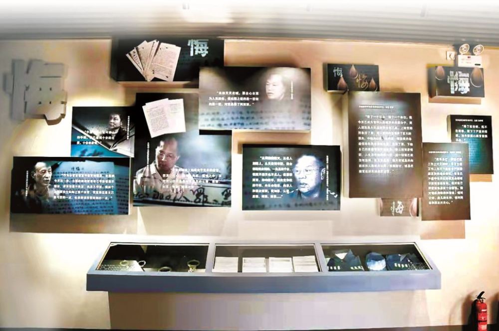 图为河南省安阳县警示教育基地思廉厅中的忏悔墙,以违纪违法干部的忏悔书为背景,突出泣着血泪的“悔”字。邵焕 摄