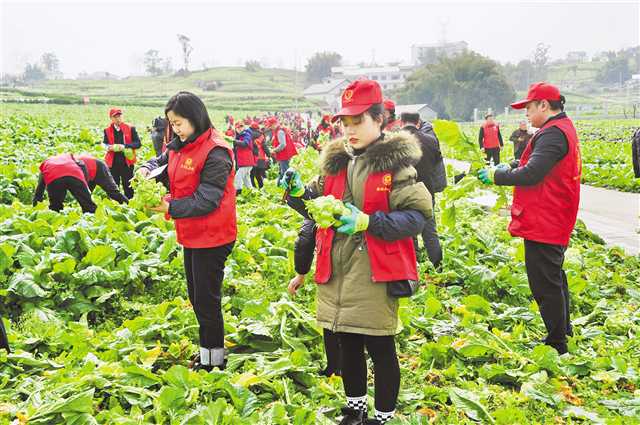 2月14日,涪陵区机关党员干部志愿者在江北街道二渡村助农收砍青菜头。通讯员 何乾健 摄/视觉重庆