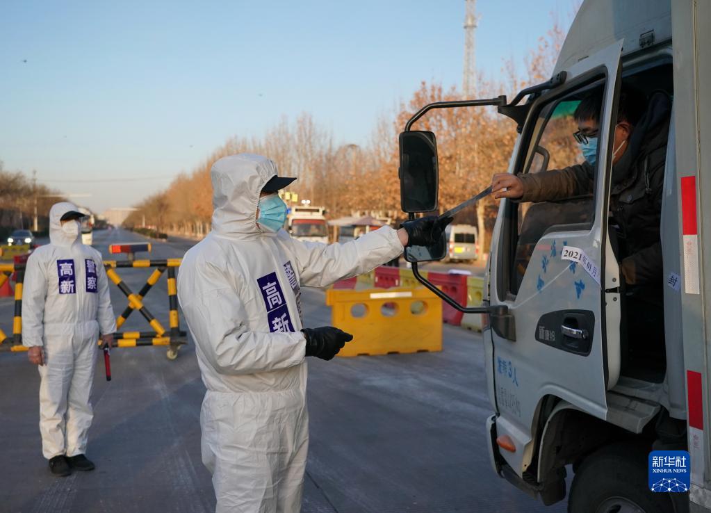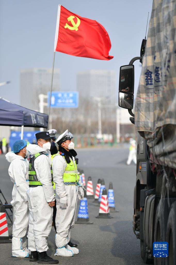 石家庄市公安局高新技术产业开发区公安分局民警在藁城区通往市区的路口执勤(2021年1月10日摄)。当日是首个“中国人民警察节”。新华社记者 杨世尧 摄