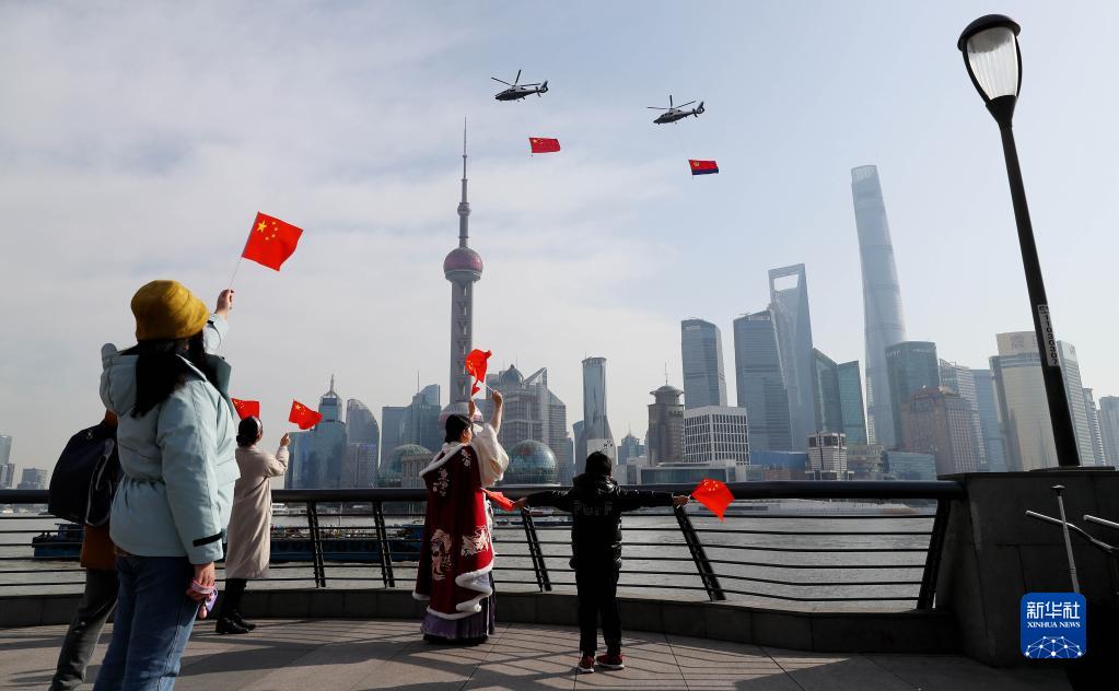 两架悬挂国旗和警旗的警航直升机飞过上海外滩,庆祝首个“中国人民警察节”(2021年1月10日摄)。新华社记者 方喆 摄