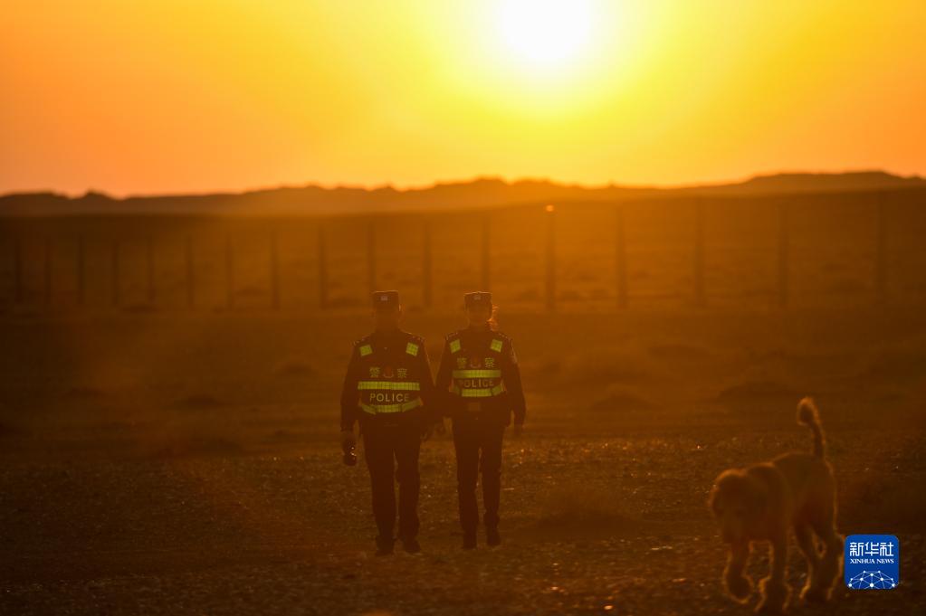 内蒙古阿拉善边境管理支队银根边境派出所戍边夫妻警务室的徐乃超和李文娜在边境线附近巡逻(2022年4月18日摄)。新华社记者 彭源 摄