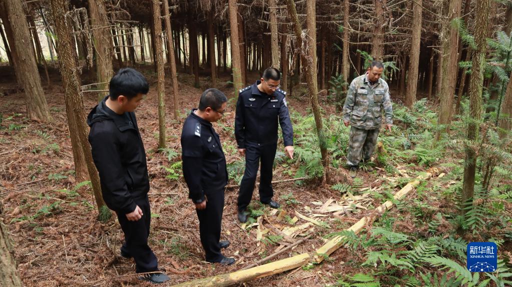 福建省南平市浦城县公安局石陂森林派出所所长郭晓强(右二)在盗伐林木案件现场分析作案动机(2020年12月11日摄)。新华社记者 赵雪彤 摄