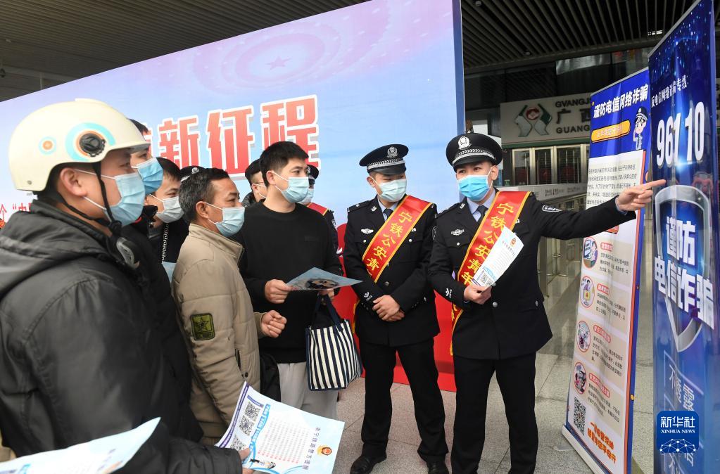 在广西南宁东站,南宁铁路公安处民警向旅客宣传防电信诈骗常识(2022年1月9日摄)。新华社记者 陆波岸 摄