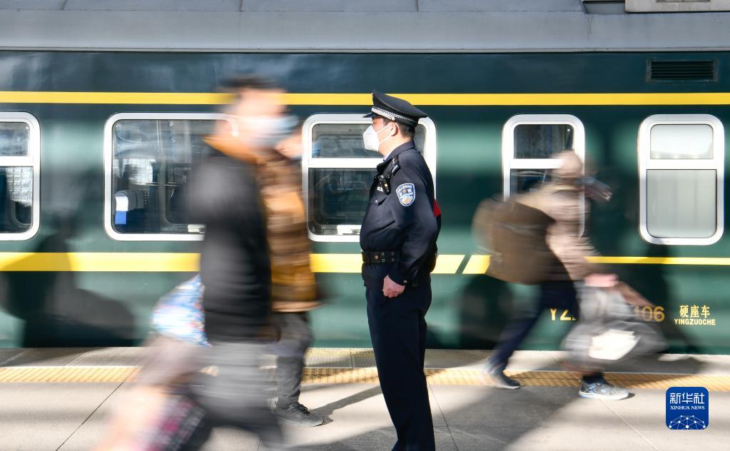 北京铁路公安局天津铁路公安处乘警支队四大队民警高天顺在天津站执勤(2021年2月3日摄)。新华社记者 孙凡越 摄