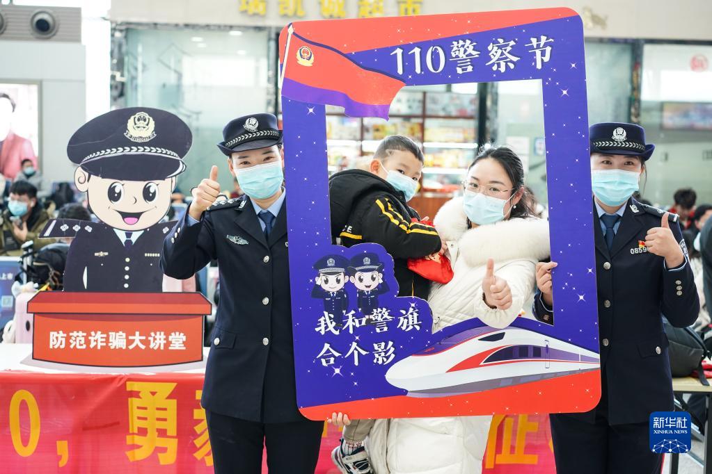 南京铁路公安处联合南京市公安局公交治安分局在南京火车站举行迎接“中国人民警察节”活动,民警和旅客在活动上合影(2022年1月7日摄)。新华社记者 季春鹏 摄