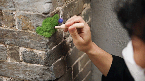 最初,罗盛天只是抱着美化和保护的心态,用羊毛毡填补城市的缺角。在南亭村,年久失修的村屋外墙总有一些破损的地方。在狭窄的巷子里,路过的行人和玩耍的孩子总会不小心被蹭到。罗盛天想到自己小时候在路上骑车,车子侧翻,石阶上的缺角将他的门牙都磕碎了。