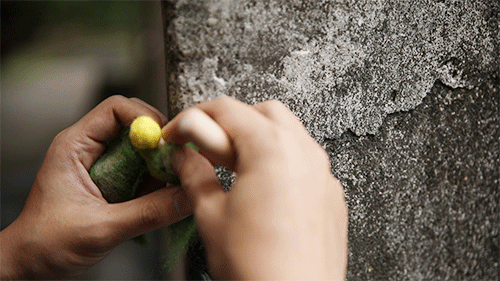 这不是一朵真的花,而是羊毛毡制作的仿真花,开出花的地方原本是个缺角。那天,罗盛天和朋友路过,悄悄地将缺角擦干净,填上黏土,然后把小花的梗塞进黏土里,再将羊毛毡绿草戳进黏土,最后把每个边角修整干净。