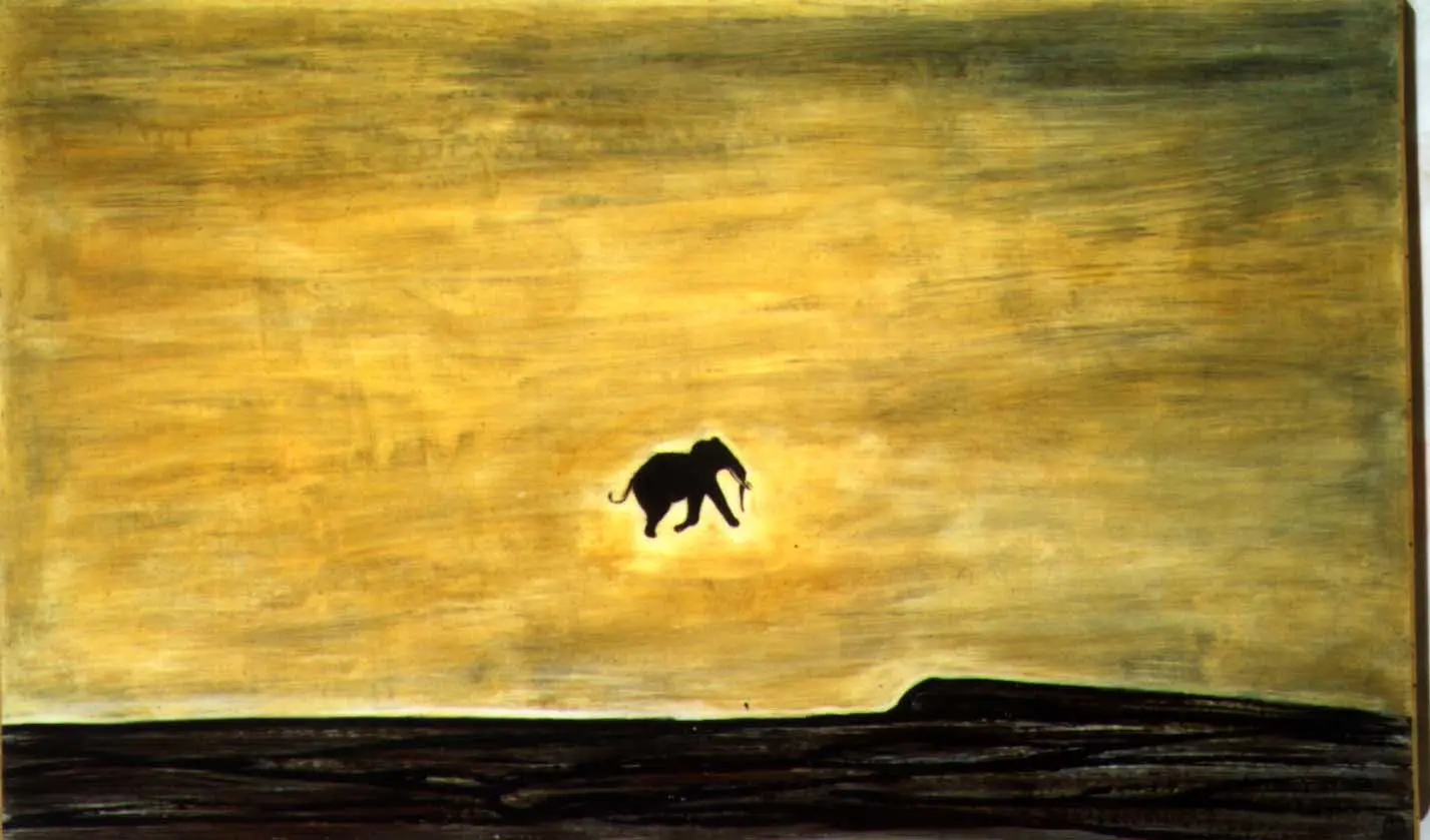 这幅画名为《孤独的象》,画面中一头小小的、乌黑的小象在无垠沙漠中孤独地奔跑着。