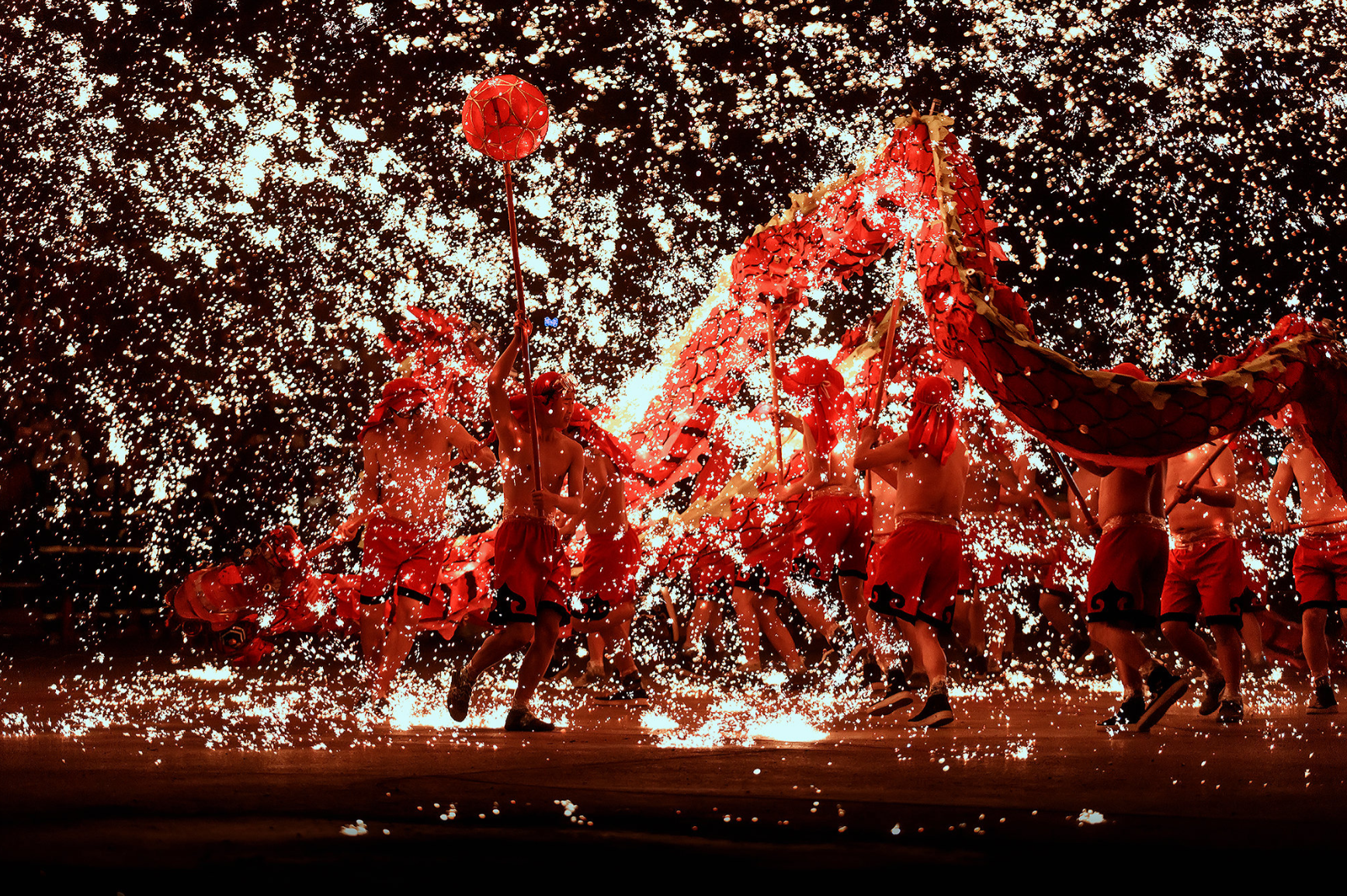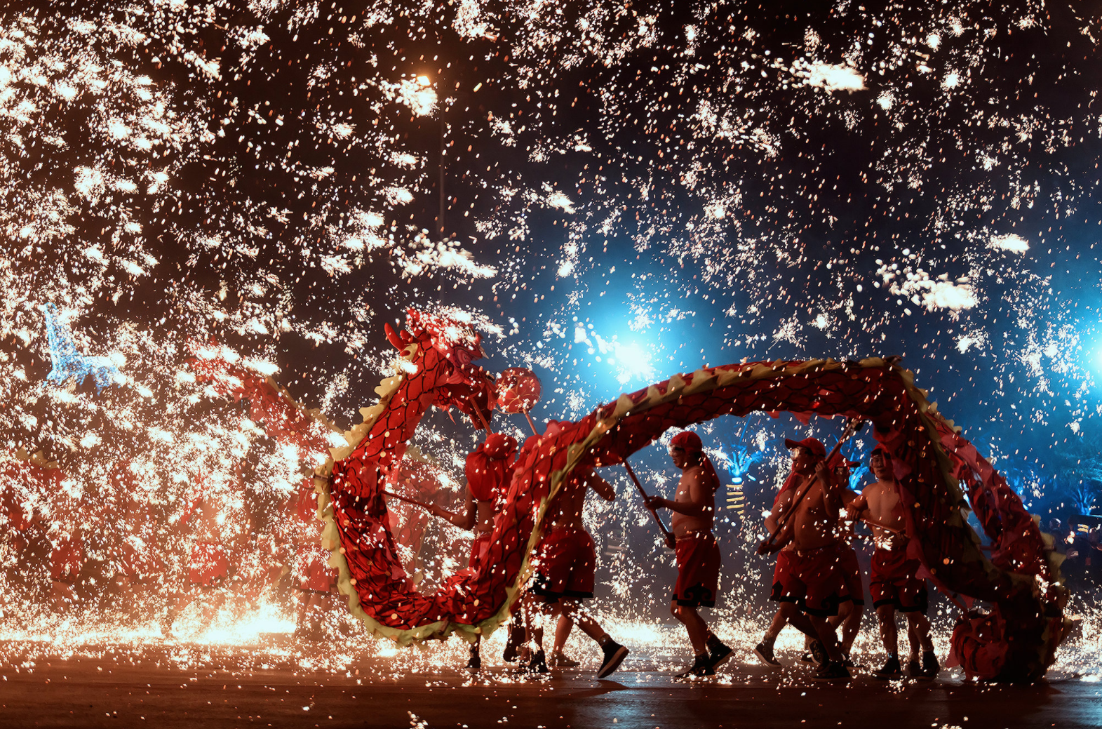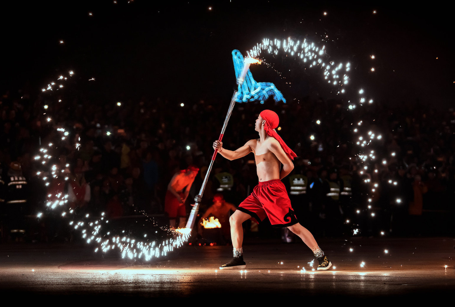 火龙舞通常在晚上表演,打铁水是其中最引人注目的环节。铁水在空中散开,仿佛烟花一样从天而降。