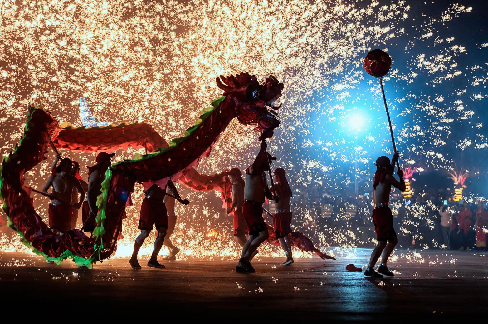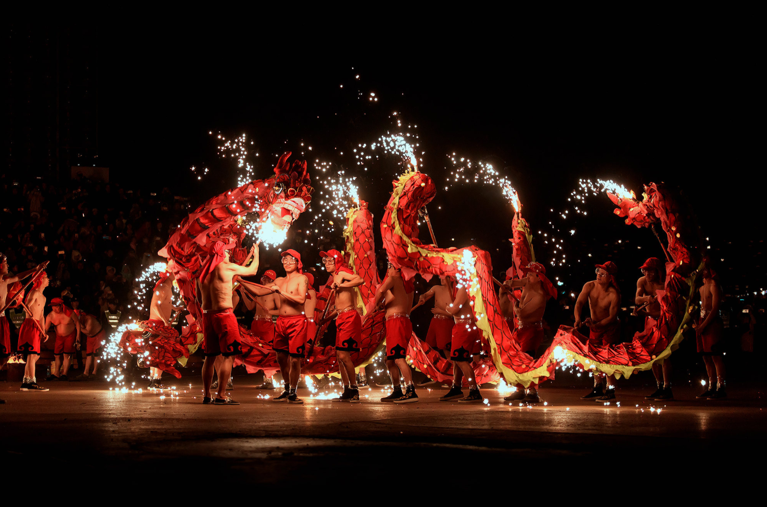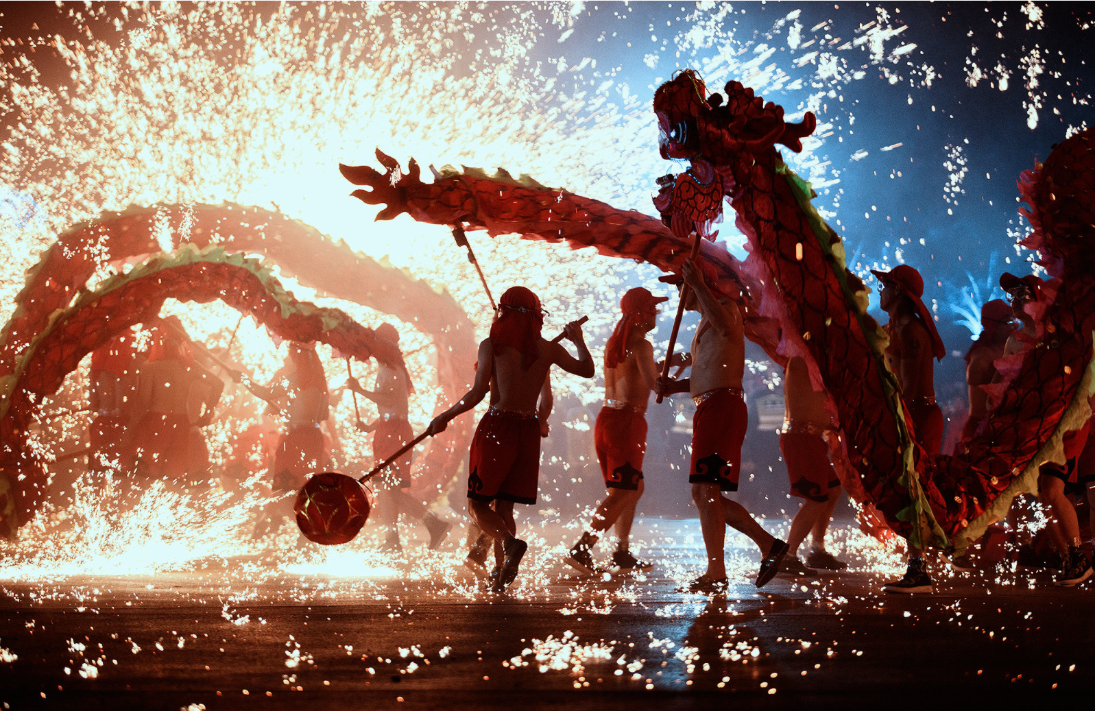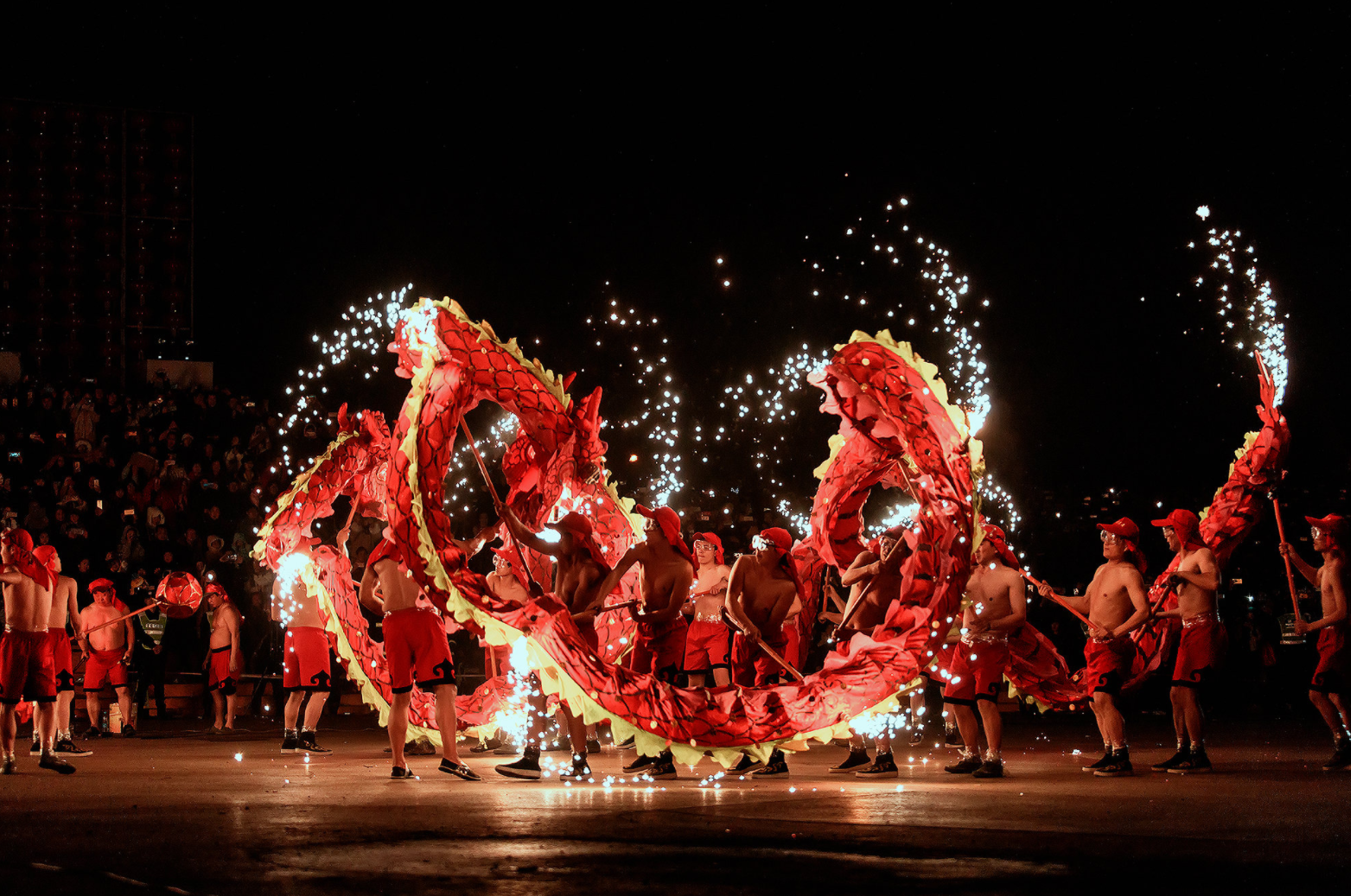 火龙舞通常在晚上表演,打铁水是其中最引人注目的环节。铁水在空中散开,仿佛烟花一样从天而降。