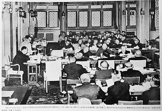 1957年10月18日,全国人大常委会和全国政协常委会举行联席会议,讨论1966年到1967年《全国农业发展纲要(修正草案)》。图为中央书记处书记谭震林在会上作关于修改后的《全国农业发展纲要(草案)》的说明。