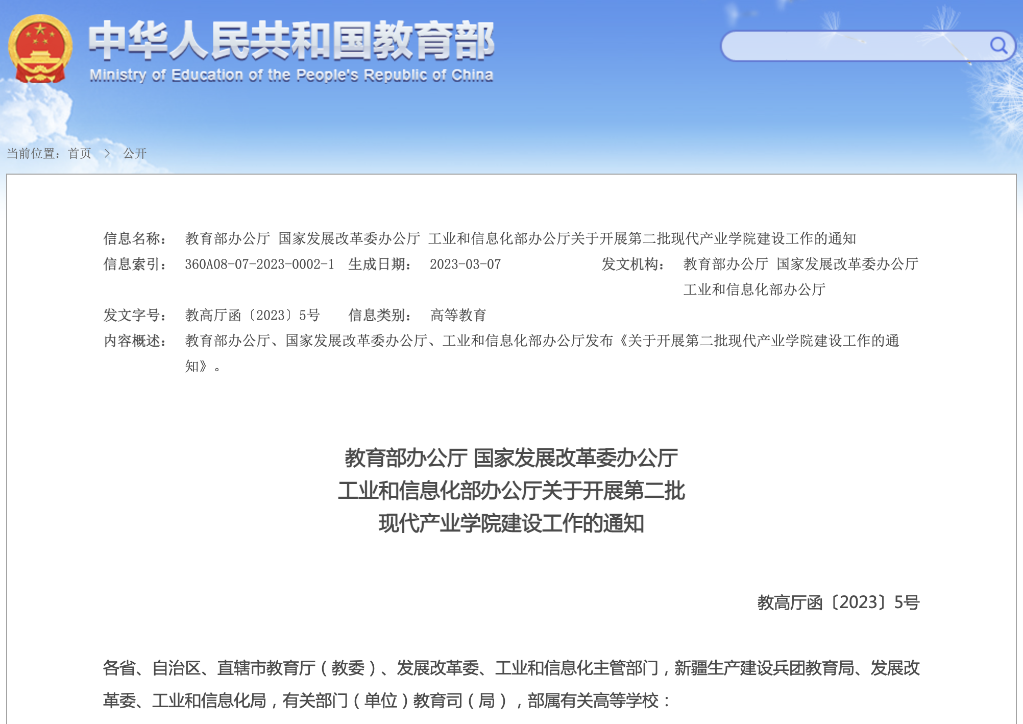记者3月14日从教育部获悉,为培养适应和引领现代产业发展的高素质应用型、复合型、创新型人才,教育部办公厅、国家发展改革委办公厅、工业和信息化部办公厅联合发布《关于开展第二批现代产业学院建设工作的通知》,开展第二批现代产业学院建设工作。