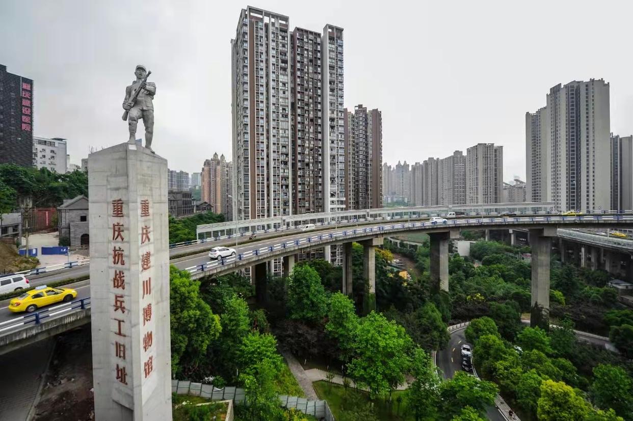 重庆主城九龙坡区鹅公岩大桥头,一尊手握钢枪怒吼射击的抗日军人雕像跨立石碑之上,面朝东方,日夜守望着奔流不息的长江。雕像下方的岩壁里,隐藏着百余个纵横交错的人工岩洞。